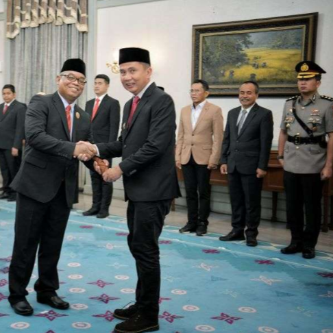 Penjabat Gubernur Jawa Barat Bey Machmudin mengukuhkan Wahyu sebagai Kepala Kantor Regional (Kanreg) III Badan Kepegawaian Negara (BKN) Bandung yang baru, di Gedung Negara Pakuan, Kota Bandung, Rabu (11/12/2024).